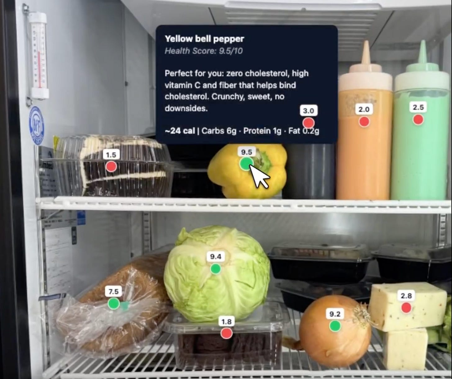 The resulting model can perform visual nutritional analysis; for instance, it can generate interactive wellness displays, such as color-coded food guides for a pescatarian with high cholesterol: