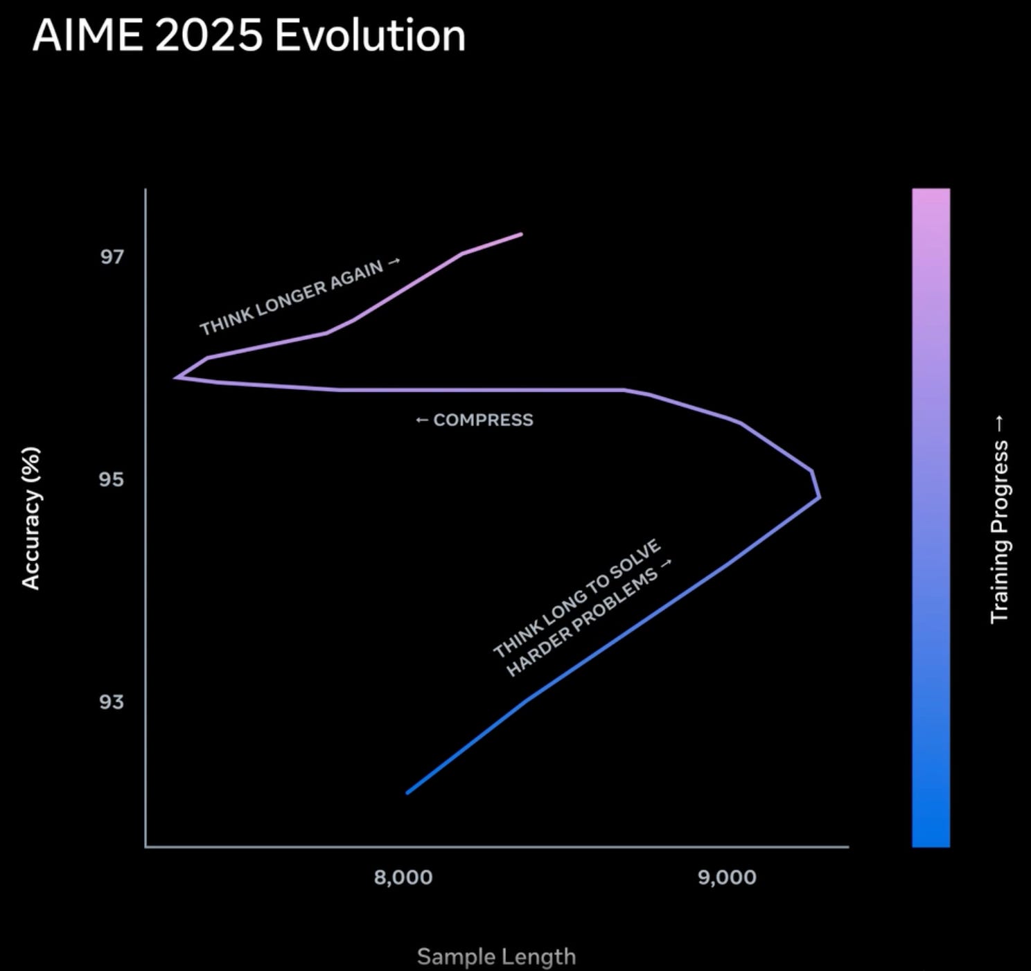 Initially, the model solves complex problems by thinking for longer periods and generating detailed internal tokens. As the length penalty activates, it enters a compression phase, forcing the system to solve the same problems using significantly fewer reasoning tokens.